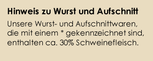Um Ihnen die Frische und Verfügbarkeit vieler unserer Spezialitäten gewährleisten zu können, möchten wir Sie bitten, bei Bedarf an großen Mengen z.B. Schnitzel, Rouladen etc., unseren selbstgemachten Braten oder auch Grillartikeln mindestens 3 Tage vorher vorzubestellen und alle Spezialitäten außerhalb unserer Saison bitte 1 Woche vorher. So können wir unsere Spezialitäten stets frisch und punktgenau für Sie herstellen und zurückstellen. Wir danken sehr für Ihr Verständnis.
