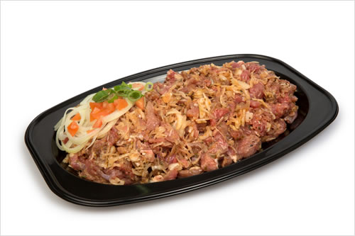 Putenfleisch, Zwiebeln, Speisesalz, Gewürze, natürliches Aroma, Rapsöl, Farbstoff E160c (Paprikaextrakt), Antioxidationsmittel: E307 und E304