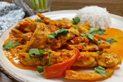 Das Puten-Paprika-Geschnetzelte mit Reis anrichten und mit frisch gehackter Petersilie servieren. Guten Appetit!