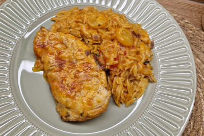 Für die Soße wird die Gemüsebrühe, die Sahne und das Tomatenmark in einer Schüssel glatt verrührt. Die Soße wird mit Salz und Chiliflocken abgeschmeckt und danach gleichmäßig über die Risoni-Gemüsemischung in die Auflaufform gegossen. Anschließend wird alles nochmals vorsichtig vermengt, damit sich die Soße gut verteilt. Nun werden die marinierten Putenscheiben auf der Oberfläche des Auflaufs ausgelegt. Jedes Stück Fleisch wird mit Cheddar belegt.