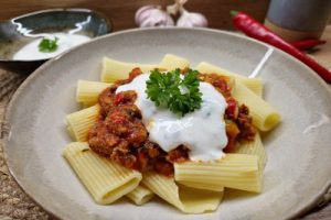 Zucchini-Hackfleisch-Nudeln mit Joghurtsoße