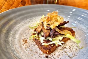 Putenleber auf Salatbett mit Zwiebelhaube
