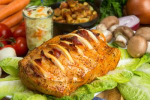 Putenräuberbraten mit Kartoffelspalten und Krautsalat